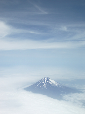羽田を飛び立った飛行機はしばらく雲の上を飛んでいたのですが、富士山が低い雲間からひょっこり顔を出していました。