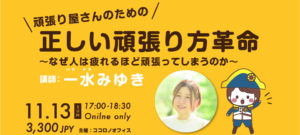 オンライン:11/13(日)17:00-18:30 一水みゆきの心理学講座「頑張り屋さんのための正しい頑張り方革命~なぜ人は疲れるほど頑張ってしまうのか〜」(1週間アーカイブ視聴可)
