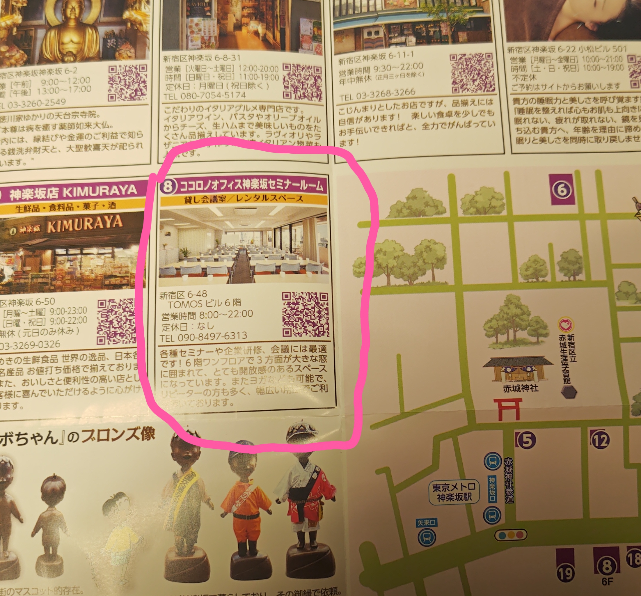 遅まきながらセミナールームのある神楽坂6丁目のお店で構成される神楽坂商店街 振興組合に加入させていただきまして、そこが発行している神楽坂マップに掲載されることになりました。